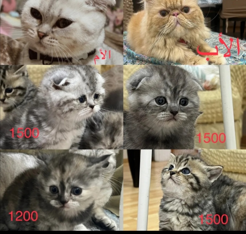 سكوتش فولد بيور وسكوتش استريت 4قطط الاب بيرشن بيكي فيس الام سكوتش فولد العمر شهر وعشرين يوم الصحه ممتازه جداً التسليم: بعد الفطام (بعمر شهرين) تقريبا يتم الحجز بعربون 500منعا للاحراج ولا يسترد الا بحاله وفاه القطه لا سمح الله ترجع لك فلوسك كامله السعر :1500 ويوجد قطط بيكي فيس من اب: بيرشن بيكي فيس وام :بيكي فيس وايت عمر شهر وعشره ايام الصحه ممتازه جدا التسليم بعد الفطام تمام بعمر ( شهرين) تقريبا يتم الحجز بعربون 500منعا للاحراج ولا يسترد الا بحاله وفاه القطه لا سمح الله ترجع لك فلوسك كامله السعر1200 يوجد قطط بيكي فيس ام :شيرازي اب:بيرشن بيكي فيس عمر شهرين الصحه ممتازه ولعوبين ومتعودين علي اللتر بوكس سعره 800للواحد يوجد قط ذكر هملايا عيون زرقاء من اب :هملايا بيور ام:شيرازي سعره 800 عمر شهرين صحه ممتازه ومتعود علي اللتر بوكس